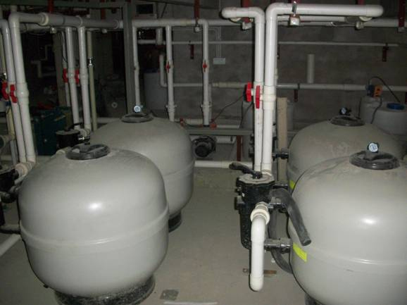 游泳池水的循环对于保证水质卫生是很重要的,如果水流组织的不恰当,则在池内个别部位就可能产生涡流配水区,在这些水区就会出现细菌繁殖较多的现象。游泳池水循环方式有顺流式、混流式、溢流式、立体循环式等。过滤器采用改良石英砂压力式,过滤水由上往下经过石英砂滤层,进入分散歧管,回到游泳池,反冲洗水则由万向阀门控制,以相反方向流动再经万向阀由排水管排出。直接完成循环过滤、排水、注水等工作。定期进行反冲洗,将过滤污物直接排入污水沙井,通常由沙缸压力决定。